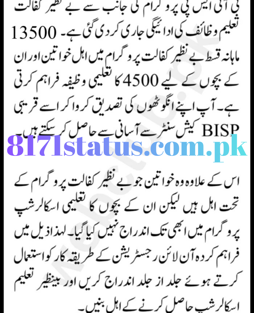 Benazir Kafaalat Taleemi Wazaif New Payment 13500+4500 – Check your BISP payment online via 8171 portal, verify status via SMS, and collect through authorized agents, banks, or mobile wallets safely and on time.